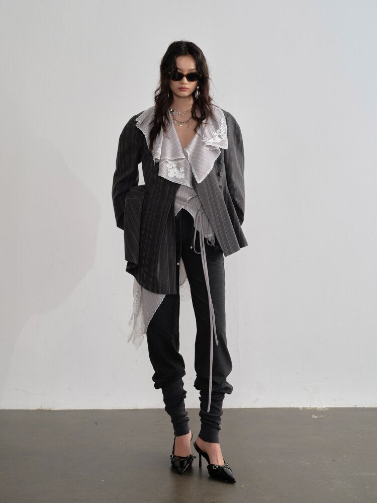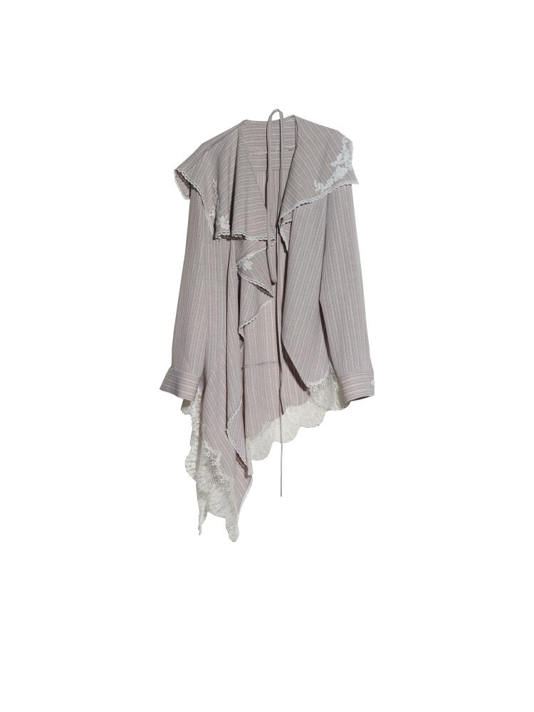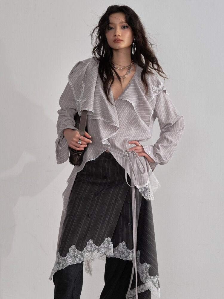 Lace Applique Ruffled Striped Shirt【s0000015700】